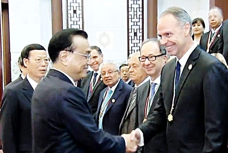 李克強(左)親切會見愛德華(右)等榮獲“中國政府友誼獎”的外國專家(熒屏截圖)